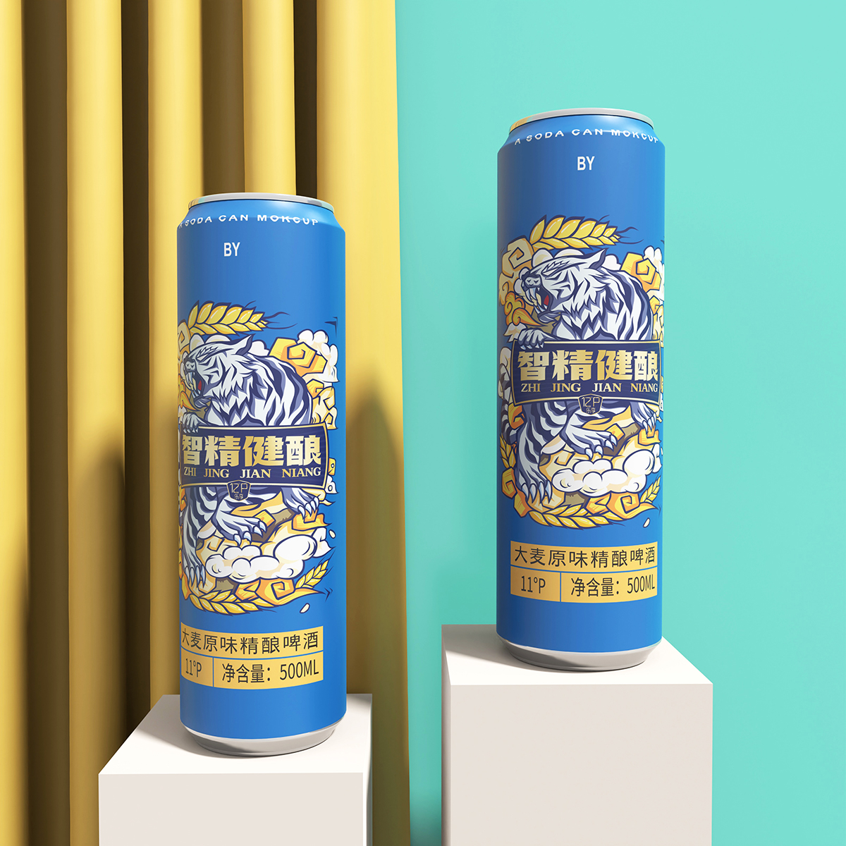 精釀啤酒虎圖騰包裝設(shè)計(jì):老虎是萬獸之王,他是力量和威嚴(yán)的象征,是原始圖騰代表吉祥和幸福,最原始、最鮮活就是智精健釀的品牌含義,以虎為主題,配合麥穗、祥云等元素點(diǎn)綴,繪制畫出。
