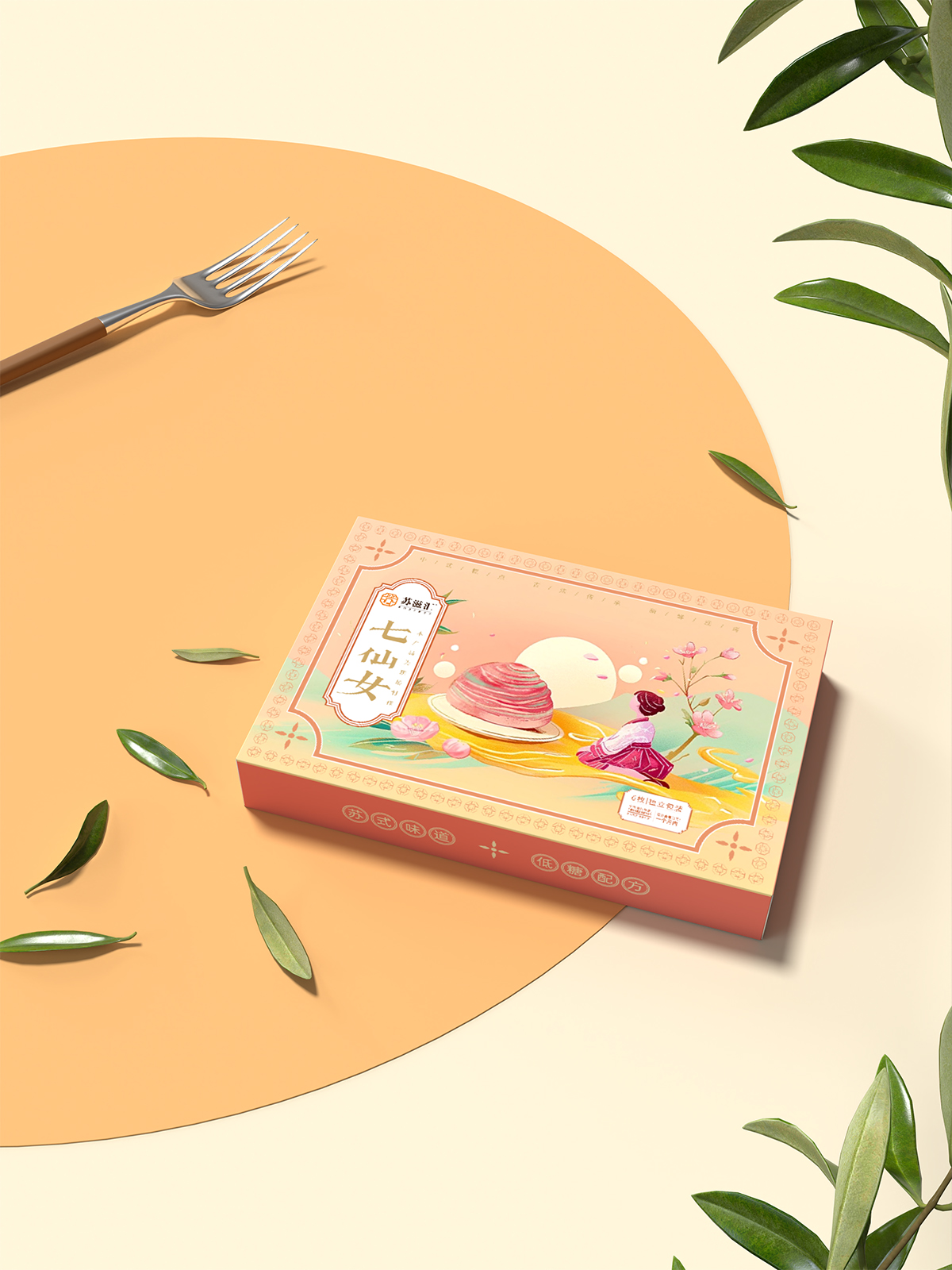 七仙女糕點包裝設計,以月圓之夜七仙拜月為背景,把玫瑰酥融合其中,通過鮮艷的色彩打造融合的范圍,突出產品賣點。經(jīng)典傳承 手工彩酥,上佳用料,新鮮現(xiàn)制,手工秘制酥皮,薄如蟬翼,上佳用料,成就撲鼻好味道,餡料滿滿,沉浸式蘇式個糕點,霓虹云裳尋至味, 特為人間做好酥。