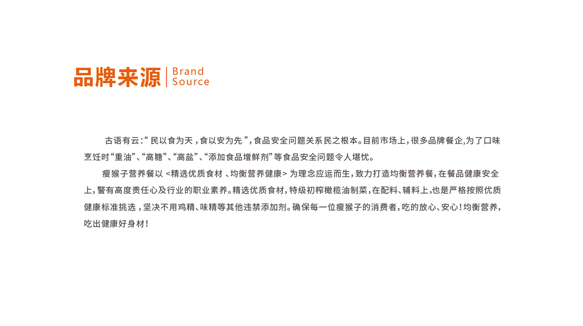 品牌創(chuàng)意關(guān)鍵詞: 均衡營養(yǎng)餐  健身減肥餐   瘦猴子品牌  高品質(zhì)生活   ◆ 開創(chuàng)新品類