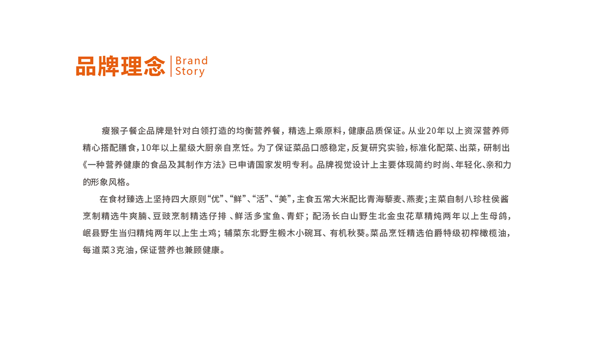 品牌介紹: 瘦猴子餐企品牌是針對白領(lǐng)打造的均衡營養(yǎng)餐, 精選上乘原料, 健康品質(zhì)保證。 從業(yè)20年以上資深營養(yǎng)師精心搭配膳食,10年以上星級大廚親自烹飪。 為了保證菜品口感穩(wěn)定,反復(fù)研究實驗,標(biāo)準(zhǔn)化配菜、出菜, 研制出《一種營養(yǎng)健康的食品及其制作方法》 已申請國家發(fā)明專利。 品牌視覺設(shè)計上主要體現(xiàn)簡約時尚、年輕化、親和力的形象風(fēng)格。
