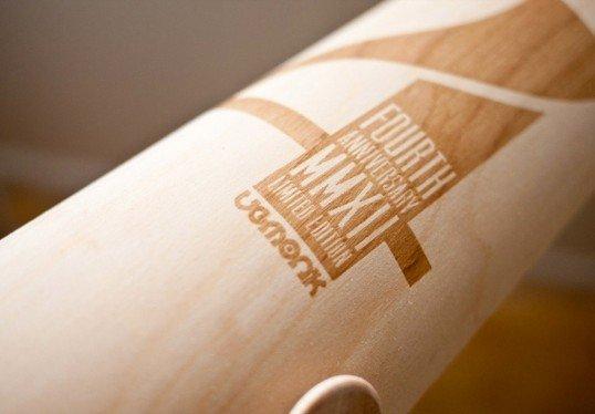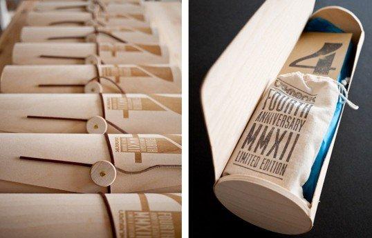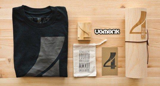 Ugmonk為慶祝其品牌成立四周年特別推出了限量款的t恤,200件100%純棉的黑色t恤被精心包裹在一個(gè)由白樺木皮制作的圓筒內(nèi),外側(cè)用激光雕刻出4周年的字符。包裝內(nèi)還附贈(zèng)了一個(gè)由回收銀杏木制作的紀(jì)念印章,一張帶有設(shè)計(jì)師親筆簽名和手工加蓋的卡片。