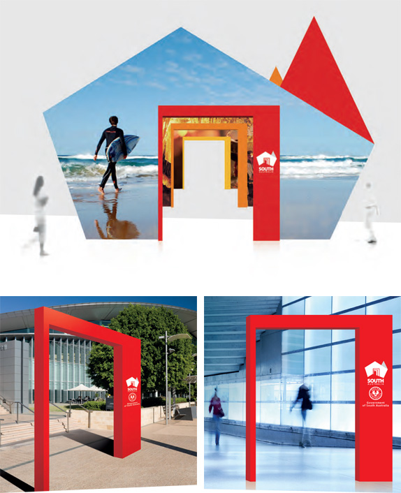 新Logo由澳大利亞地圖的形狀衍生而成,紅色澳洲地圖圖標(biāo)上的敞開(kāi)調(diào)黃色門的位置正好展現(xiàn)了南澳州是整個(gè)國(guó)家的中心門口的位置。這是一個(gè)多形態(tài)的標(biāo)識(shí),它可以應(yīng)用于各種的形式,由不同圖案的窗口變成了另一圖形的門。