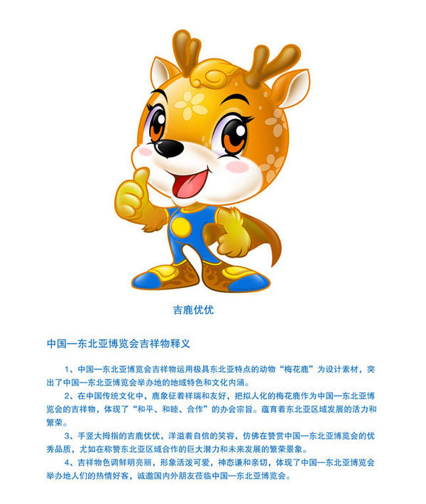 2、在中國傳統(tǒng)文化中,鹿象征著祥瑞和友好,把擬人化的梅花鹿作為中國—東北亞博覽會的吉祥物,體現(xiàn)了“和平、和睦、合作”的辦會宗旨。蘊(yùn)育著東北亞區(qū)域發(fā)展的活力和繁榮。
