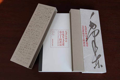 《毛澤東同志在延安文藝座談會(huì)上的講話》(百位文學(xué)藝術(shù)家手抄珍藏紀(jì)念冊(cè))(作家出版社)手抄本,文字也是手抄風(fēng)格,在設(shè)計(jì)排版方面十分成熟,很精煉,書(shū)脊用紙很好,重點(diǎn)內(nèi)容文字較大,一般內(nèi)容文字較小,層次分明;封面精致且大方,是一個(gè)盒子,恰似一個(gè)“豐碑”的形態(tài),很有層次感,有強(qiáng)烈的三維感;政策性的文字表現(xiàn)地不單調(diào)不枯燥,可以把文獻(xiàn)與文獻(xiàn)歷史巧妙地結(jié)合起來(lái),很能使人產(chǎn)生親近感,是對(duì)政治性文件的革新,很有創(chuàng)新。