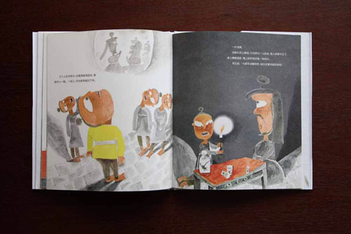《穿墻術(shù)》(浙江少年兒童出版社) 繪圖表現(xiàn)力強(qiáng),以暖色調(diào)營(yíng)造了很好的氛圍;文字與繪圖協(xié)調(diào)一致,位置編排合理,圖片的視角一直在變化,富有節(jié)奏感;合和頁(yè)構(gòu)建了寬闊的閱讀空間,人物如同舞臺(tái)表演一樣,生動(dòng)形象;版權(quán)頁(yè)與正文不放在一個(gè)合和頁(yè)上會(huì)更好,封面的紙板稍嫌厚重。