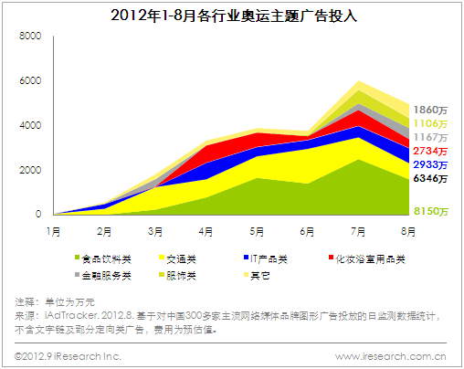 2012年倫敦奧運會于當?shù)貢r間7月28日開幕,歷年來的奧運會不僅是一項體育盛事,也逐漸發(fā)展為一個營銷熱點。成功的奧運營銷能夠快速提升品牌知名度和好感度,從而促進銷售。知名品牌可口可樂和三星都曾借助奧運開展營銷活動,并取得了巨大的成功。此次倫敦奧運廣告主網(wǎng)絡品牌廣告投放情況如何呢?iResearch艾瑞咨詢根據(jù)網(wǎng)絡廣告監(jiān)測系統(tǒng)iAdTracker的最新數(shù)據(jù)研究發(fā)現(xiàn),奧運主題廣告7月攀上高峰,食品飲料類和交通類廣告主更為重視這一營銷機會點。奧運主題廣告主要選擇在門戶網(wǎng)站進行投放,另外視頻網(wǎng)站也有不錯的表現(xiàn)。