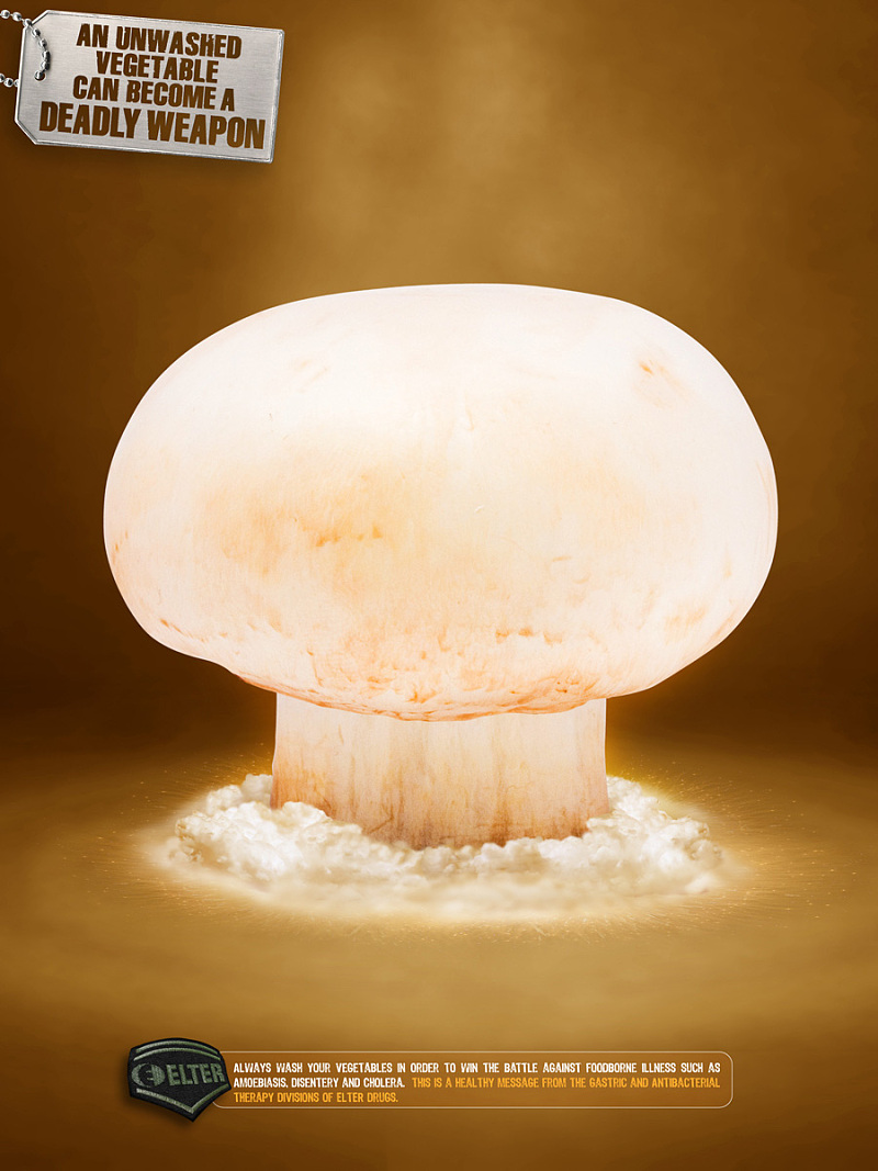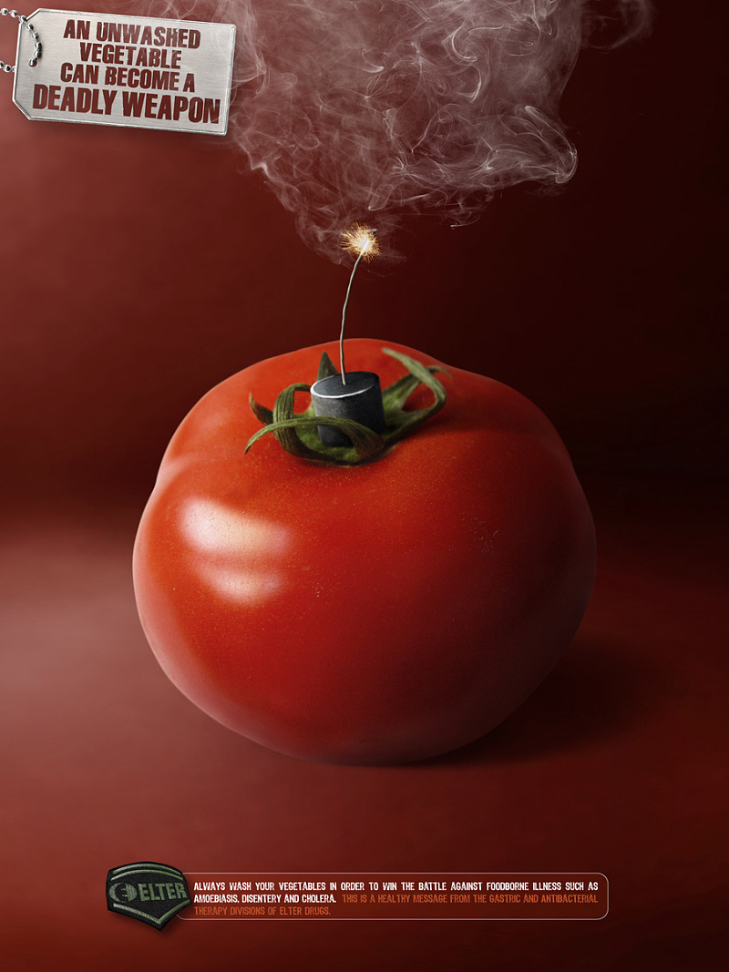 這個(gè)廣告通過(guò)把一個(gè)未洗的洋薊比喻成炸彈來(lái)警告公眾食源性疾病的危害。 通過(guò)創(chuàng)建一個(gè)視覺(jué)比喻,Elter藥業(yè)公司能夠傳達(dá)有關(guān)食品安全和Elter藥物自己的抗菌治療部門的強(qiáng)烈信息,而不顯示任何敏感的圖像。