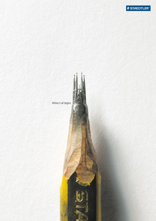 看看Staedtler文具公司的這則廣告。 其中顯著體現(xiàn)了比例縮放的原則——首先,鉛筆已經(jīng)放大了很多,但重點(diǎn)仍然在被雕刻成精美大教堂的筆尖上。使用大幅度的比例縮放不僅能夠吸引觀眾看得更仔細(xì),而且還強(qiáng)化了“大始于小”的概念。