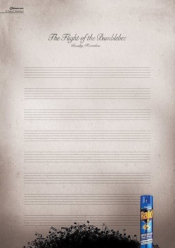 這個(gè)Raid殺蟲劑的廣告,用 產(chǎn)品“殺死”了著名音樂(lè)家——Rimsky-Korsakov譜寫的“大黃蜂飛行”的音符(把音符比作擾人的蚊蟲),意味著Raid殺蟲劑足夠強(qiáng)大,可以消除任何蟲子。 這個(gè)廣告看似很荒謬,但是這種如此明顯的不真實(shí)會(huì)讓人覺(jué)得搞笑,而不是欺騙或誤導(dǎo)。