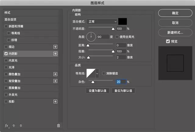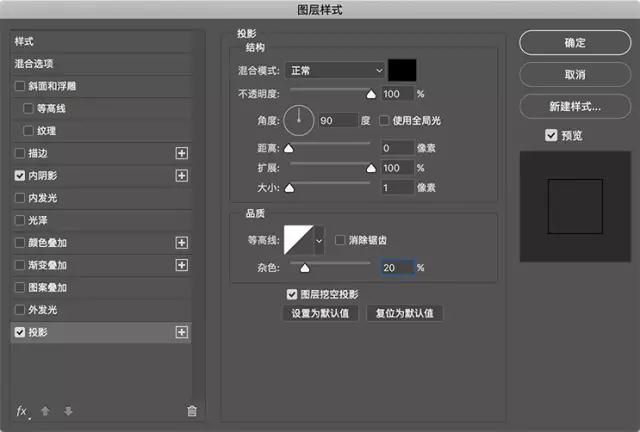 將智能對象圖層的填充不透明度設(shè)置為0,添加一個內(nèi)陰影樣式設(shè)置如下。還要創(chuàng)建一個投影,只有1px的大小。這兩個陰影一起形成具有粗糙邊緣的筆畫/輪廓效果。