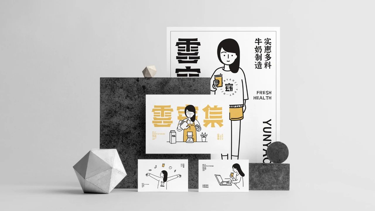這個叫云窈集的茶飲品牌,是一個主打年輕化的品牌。云窈集的LOGO設(shè)計是圖形+中文+拼音的組合,圖形部分是一位女孩子垂眸品嘗一杯茶飲,中文字體部分采用了少筆畫的處理方式,繁體“雲(yún)”最下面的筆畫簡潔成一筆,集則是直接少了一豎,是比較符合當(dāng)代年輕人的喜好的表現(xiàn)方式。LOGO的圖形延伸成多個動作不一的女孩形象,用漫畫的形式表現(xiàn)出來,顏色上采用了暖色系的黃色,漫畫女孩身上或多或少地帶上相應(yīng)的黃色,給人一種溫暖清新的感覺。輔助圖形用標(biāo)志字體的偏旁抽象而成,代表了云窈集飲料工廠。云窈集的飲品包裝主要是從標(biāo)志入手,將標(biāo)志進(jìn)行不同方式的組合,從而形成豐富的包裝樣式。物料的設(shè)計則是標(biāo)志和漫畫的搭配使用,漫畫女孩的神情和動作傳達(dá)出熱愛生活的感覺,生活很苦,但依舊可以選擇熱愛。