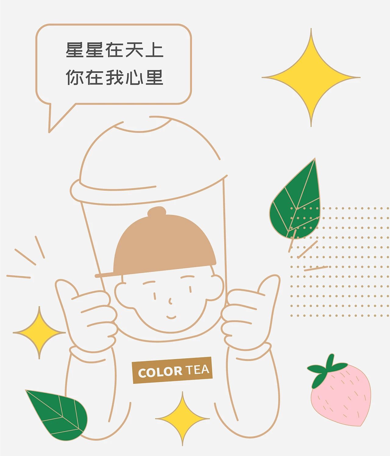 茶小色的LOGO運用一位手持奶茶杯,頭上反戴著鴨舌帽,將眼睛畫成一對愛心形狀的小男孩作設(shè)計,整體看起來憨憨的特別可愛,而且LOGO是由品牌IP簡化而來,突出品類,與品牌調(diào)性一致。因為茶小色主要突出”色“字,所以整個品牌都是圍繞著這個字的意思來設(shè)計。品牌輔助圖形比較的別致,一個圓形內(nèi)部寫著“se”兩個拼音字母,上面寫著一句土味情話,下面放著一句狠話,兩句話在一起,讓人哭笑不得,感覺非常的可愛。該品牌設(shè)計最有趣的地方就是這里,將IP延展出來插畫。插畫做的也是挺細(xì)心的,一位小青年眼睛變?yōu)樾男,看著手中的奶茶,說著土味情話,將IP塑造成一位可愛憨厚的”渣男”形象,讓人感覺十分有趣。細(xì)節(jié)方面處理的也不錯,背景有著奶茶中經(jīng)常出現(xiàn)的黑珍珠,因為是夏天,所以還有相應(yīng)的冰塊出現(xiàn)在畫中。