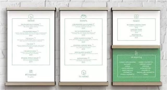 輕食不僅注重食物原本的味覺,并且將心化的概念作為主要的核心。與追求佐料帶來的味覺爽快不同的是,輕食以健康、養(yǎng)生、內(nèi)化作為新的飲食方式。目前來說,大部分輕食餐飲店為了突出輕食健康便捷的特點(diǎn),都會在VI和空間上采用簡約圖形、低飽和配色和大部分留白來突顯其輕食屬性,這樣的視覺設(shè)計在讓食客感到輕松愉悅的同時,更能突顯出輕食艷麗誘人的色彩,為盤中營養(yǎng)但卻可能過于寡淡的美食增添許些“風(fēng)味”。