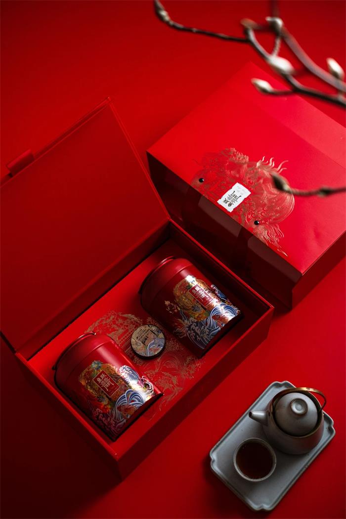 對(duì)應(yīng)插畫(huà)上的龍門(mén)造型,加以藝術(shù)化處理,再次呼應(yīng)產(chǎn)品主題。內(nèi)盒的小罐茶葉采用鋁制包裝,罐身上粗下細(xì)的漸變?cè)O(shè)計(jì),以桶式的設(shè)計(jì)呈現(xiàn)優(yōu)雅沉穩(wěn)的包裝屬性。打開(kāi)后的包裝還可發(fā)現(xiàn)魚(yú)躍龍門(mén)的插畫(huà)以鍍金工藝的方式印在內(nèi)盒底部,搭配鮮明配色,形成良好的視覺(jué)互動(dòng)。