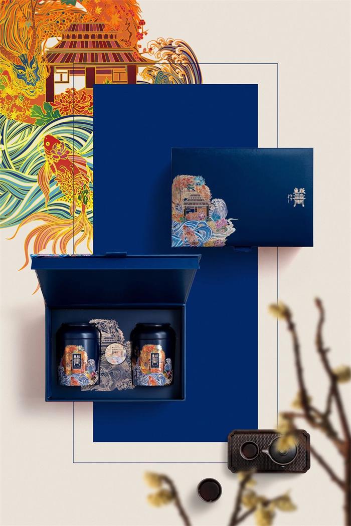 紅、藍(lán)兩款包裝彰顯茶葉的端莊大氣,插畫(huà)靈感取自中國(guó)“鯉魚(yú)躍龍門(mén)”的傳說(shuō)故事,鯉魚(yú)、龍門(mén)及龍的形象刻畫(huà),扁平化設(shè)計(jì)再現(xiàn)經(jīng)典的場(chǎng)面設(shè)定,也象征著勵(lì)志向上的設(shè)計(jì)理念。右側(cè)的燙金LOGO的“門(mén)”字設(shè)計(jì)