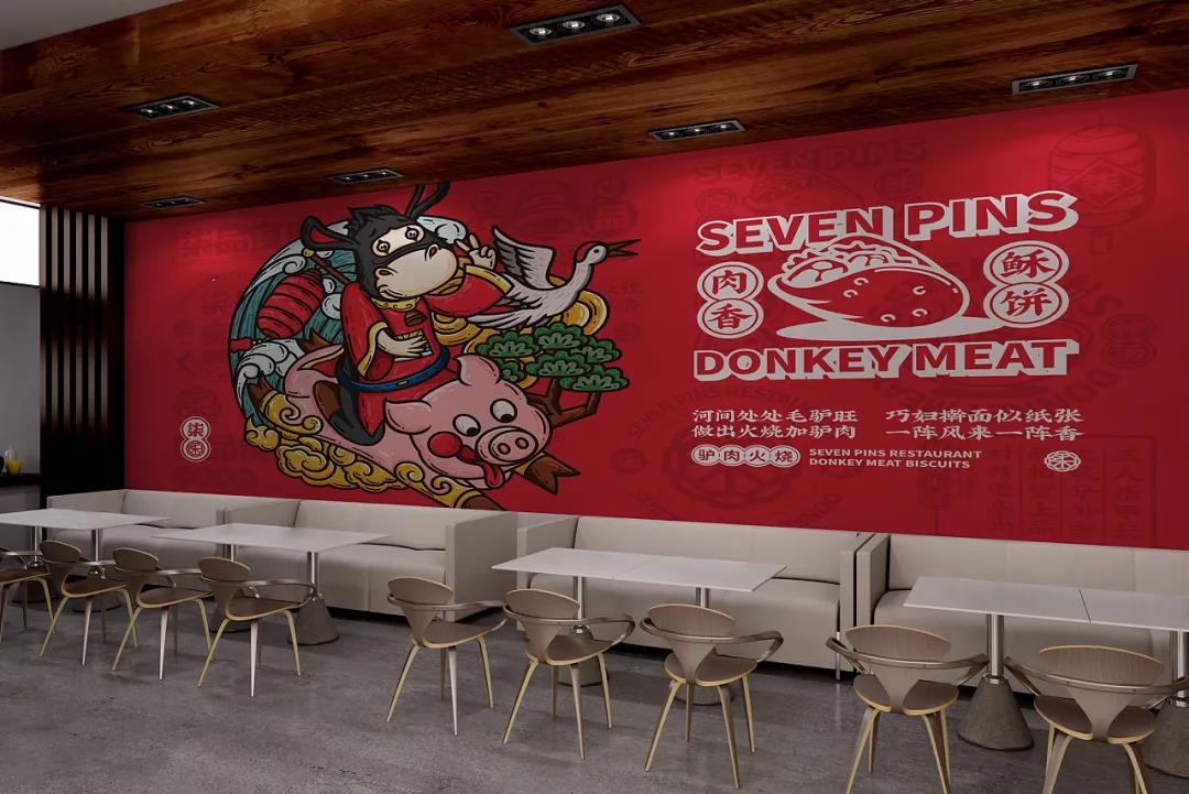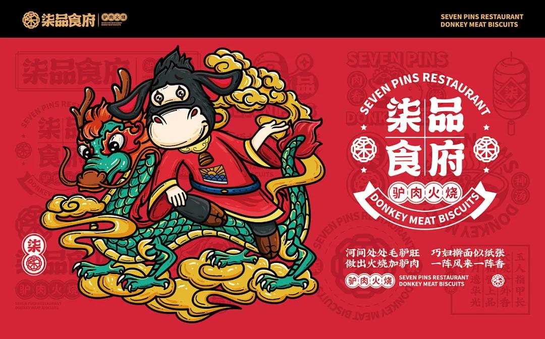 品牌根據(jù)品類塑造了一個驢IP,擬人化處理后的驢IP,形態(tài)更接近Q版,兩只驢耳朵向外伸展,隨著表情動作向上或向下伸展,很是靈動。傳統(tǒng)服飾在身,對驢肉火燒的歷史悠久進(jìn)行不經(jīng)意的刻畫。驢IP拿著不同的東西做出不同的動作時(shí),形象就變得年輕起來了,十分有趣。驢IP與青龍、鯉魚、嫩豬以及小雞等具有中式代表性的動物進(jìn)行搭配,創(chuàng)作出一幅幅國潮風(fēng)插畫,是對美好寓意的向往和憧憬,也突出品牌的包容性和多樣性特點(diǎn)。品牌的輔助圖形就比較常見了,從標(biāo)志和IP中延展,與文案和簡筆食材、菜品結(jié)合,以此更好的宣傳柒品食府這個品牌。