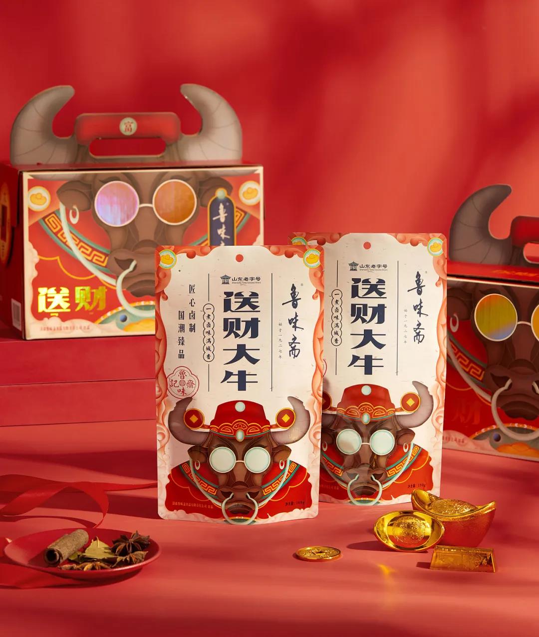 魯味齋是一個山東老字號鹵制品品牌,這款送財大牛禮盒,將牛年與財神結(jié)合,賦予了很濃厚的祝福愿景。
