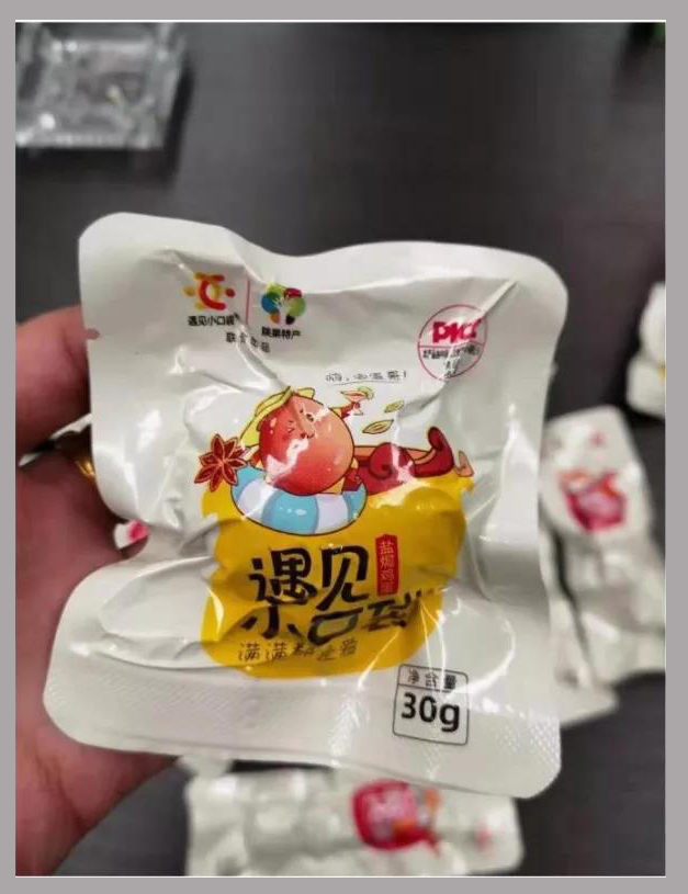 設(shè)計配色時用了棕色系,既突顯了鹵蛋本身的顏色,與白底包裝袋形成鮮明對比,同時這樣一深一淺的搭配,也讓整體畫面更加明快。