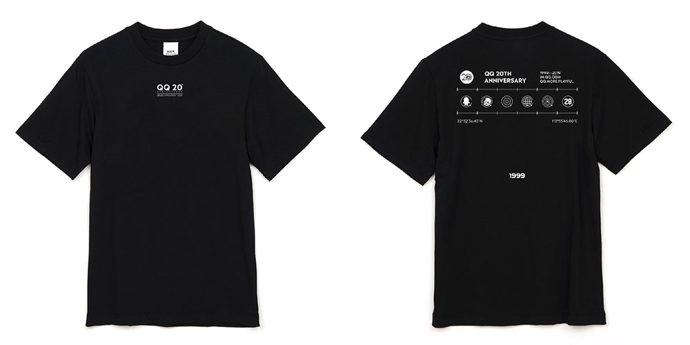 T恤的圖案從QQ20周年logo圖形中延展設(shè)計出各類代表圖形,正面簡潔直接地顯示出本次主題,把醒目的圖形放置于T恤背后,利用坐標(biāo)軸和經(jīng)緯度的信息圖案配合各個抽象化的宇宙元素,增加T恤設(shè)計的科技感,更明確地展現(xiàn)了科技向善的愿景。