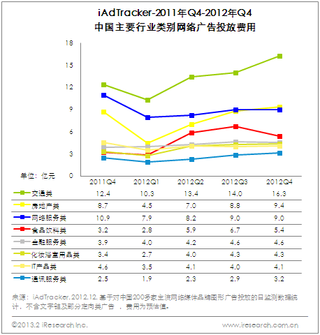 2013年網(wǎng)絡(luò)品牌廣告小幅增長(zhǎng)可期 媒體類別間競(jìng)爭(zhēng)微妙 根據(jù)艾瑞咨詢即將發(fā)布的《2012年第四季度數(shù)據(jù)產(chǎn)品監(jiān)測(cè)報(bào)告》數(shù)據(jù)顯示,2012年Q4 網(wǎng)絡(luò)品牌廣告投放費(fèi)用自2011Q1以來(lái)首次出現(xiàn)與上季度基本持平的局面,同比增長(zhǎng)依舊明顯。2013年網(wǎng)絡(luò)品牌廣告投放費(fèi)用維穩(wěn)氛圍依舊濃厚,同時(shí)小幅的增長(zhǎng)依舊可期。
