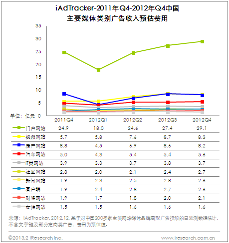 媒體類別方面,2012Q4是門(mén)戶網(wǎng)站廣告收入占比自2011Q2下降以來(lái)的首次上升,媒體類別間的市場(chǎng)格局更為撲朔迷離。另外,房產(chǎn)網(wǎng)站廣告收入基本進(jìn)入平臺(tái)期,穩(wěn)定仍是大方向;視頻網(wǎng)站逐步受到廣告主青睞,2011-2012每季度投放費(fèi)用上升明顯。