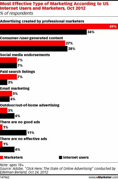 營銷人員和消費者對于各項廣告形式有效性的評估比例