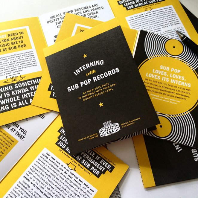 運用不同的配色方案,可以分離出若干內(nèi)容,以及添加一些視覺上的趣味。上圖中,設(shè)計師 Sasha Barr 交替使用黑、黃以及背景的白為Sub Pop 唱片實習(xí)招牌設(shè)計了一款酷酷的信息指南。