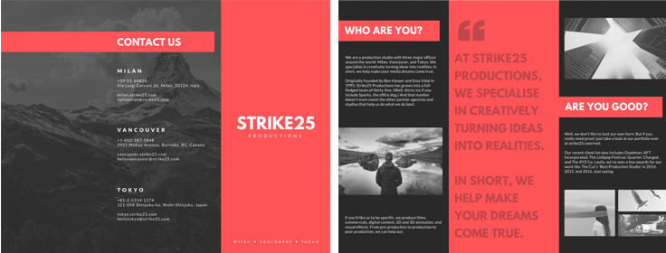 對于如何選取顏色初學(xué)者會很頭疼,不要糾結(jié)配色或者顏色的含義,使用單一的顏色吧。選取一種顏色,使用它作為背景顏色,甚至用它作為濾鏡的顏色處理圖片,用來制作單色三折頁。不是很買賬?看看上面的事例就真的很棒,使用了單一的紅色創(chuàng)建的三折頁。