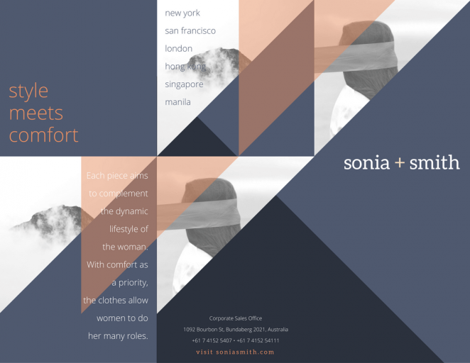 我經(jīng)?吹胶芏嗳垌摰脑O(shè)計被限制于已經(jīng)設(shè)定好的折頁內(nèi)。忘記它們,然后用一個色彩與圖形的組合,創(chuàng)造一個橫跨三折頁的迷人設(shè)計。