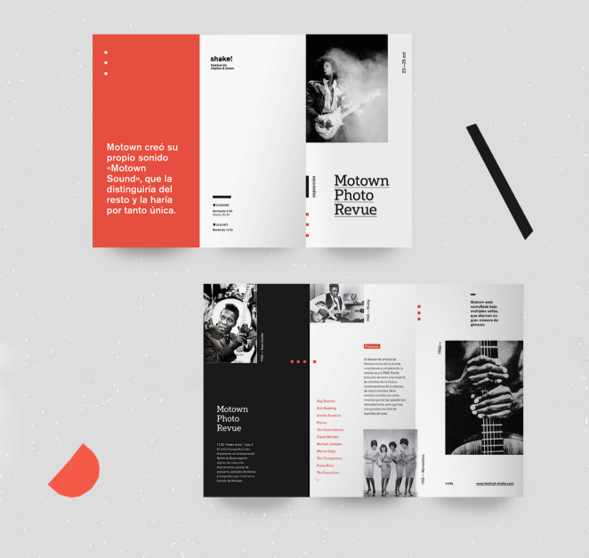 用巧妙的排版,精心策劃的圖像和復(fù)雜的設(shè)計元素設(shè)計一個現(xiàn)代感折頁。用凝固的網(wǎng)格來陳述設(shè)計,你就可以得到一個可愛的三折頁,就像上面的上面的Shake! R & B音樂節(jié)三折頁一樣。