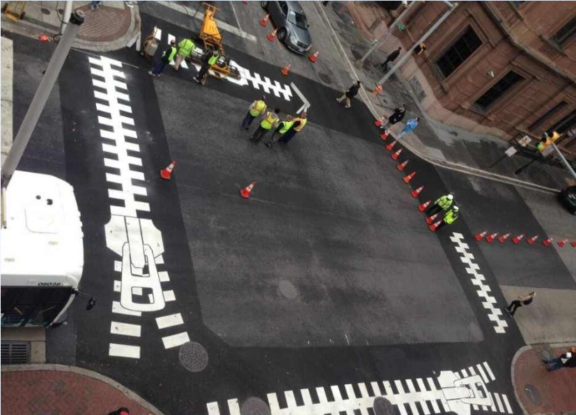 另外一位藝術(shù)家Graham Coreil-Allen,將小時候游戲跳格子的概念融入斑馬線中,并加入當(dāng)?shù)氐某鞘袣v史意涵。