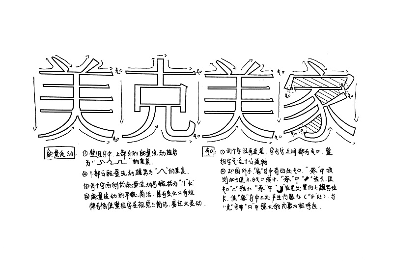 行氣-中國(guó)書法字講究行氣,指書法作品中字與字行與行之間的呼應(yīng)映帶關(guān)系。一般要求筆斷意連,聯(lián)綴成行,積行成篇,在文字的上下、左右、首尾的書寫中,既有變化,又能和諧,如清代宋曹《書法約言》稱:“勿往復(fù)收,乍斷復(fù)連,承上生下,戀子顧母!毙袣庠谛胁輹械年P(guān)系尤為重要;仡^在觀察美克美家四個(gè)字,能感覺(jué)到整組字氣韻貫通,視覺(jué)平穩(wěn)又富有變化。