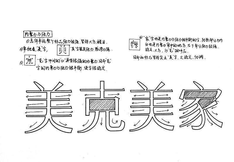 視覺(jué)誤差-中國(guó)漢字的特點(diǎn)天圓地方,方正曲直,容易給人造成錯(cuò)覺(jué),就是筆畫是上下左右對(duì)齊,這是個(gè)嚴(yán)重的誤區(qū),字體于字體之間,字體內(nèi)部各構(gòu)件之間并不是絕對(duì)的物理上的對(duì)齊,更多的是視覺(jué)上的對(duì)齊,這是因?yàn)槿搜凼怯惺清e(cuò)覺(jué)的。以美字為例,兩點(diǎn)視覺(jué)上相等,實(shí)際上左點(diǎn)要比右點(diǎn)高一些,因?yàn)樽簏c(diǎn)的筆勢(shì)向下,視線是向下的,右點(diǎn)的筆勢(shì)向上,視線是向上的,這樣做些調(diào)整,正好彌補(bǔ)了視覺(jué)上帶來(lái)的錯(cuò)別?雌饋(lái)兩點(diǎn)保持在同一水平線上。其次,美字橫左右兩端長(zhǎng)于視覺(jué)上相等,原因右捺筆勢(shì)向下,形成對(duì)外的擴(kuò)張力。每一個(gè)筆畫構(gòu)件的大小長(zhǎng)短高低錯(cuò)落,都是受到外界的影響干擾,不是孤立的存在。