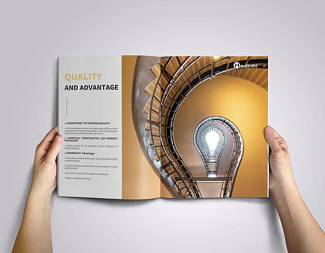 照明產(chǎn)品直接在封面展示嗎?這種設(shè)計方法并非總是管用。企業(yè)進(jìn)入品牌塑造階段以后更多的是讓用戶記住你這個品牌,進(jìn)而逐步通過產(chǎn)品來積累信任度。因此封面上不必面面俱到羅列照明產(chǎn)品,后續(xù)內(nèi)文有足夠的空間給與設(shè)計師充分的發(fā)揮。照明產(chǎn)品宣傳冊封面以簡潔的風(fēng)格,讓LOGO優(yōu)先進(jìn)入用戶的視野,并且在色彩上進(jìn)一步統(tǒng)一協(xié)調(diào),如果需要圖片素材配合,可以設(shè)計一張富有意境的家居環(huán)境照片,從而使得整本產(chǎn)品宣傳冊更富有想象的空間。
