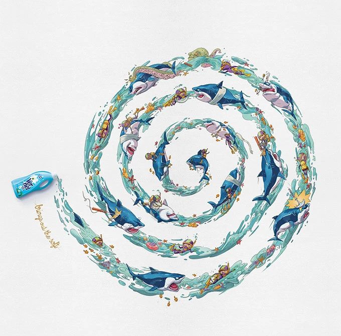 在實(shí)際的設(shè)計(jì)過程中,我們將其分成兩種類別:一種是規(guī)則型放射線條,是指所有線條都圍繞著同一個(gè)軸心進(jìn)行排列;另一種則是不規(guī)則型放射線條,是指畫面中有多個(gè)軸心,不同軸線由幾組線條分別環(huán)繞著。
