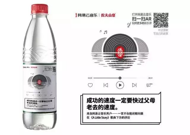 還有與網(wǎng)易云音樂(lè)聯(lián)合推出的合作限量款“樂(lè)瓶”,精選了30條用戶樂(lè)評(píng)印在4億個(gè)瓶子上,每一瓶水都自帶音樂(lè)和故事。句句“扎心”的樂(lè)評(píng)也為農(nóng)夫山泉帶來(lái)了巨大的流量。
