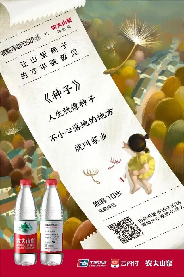 還有最近農(nóng)夫山泉推出的“詩(shī)歌瓶”,把來(lái)自四川、安徽、河南山區(qū)兒童寫(xiě)的24首詩(shī)歌印制在了瓶身上。有童心對(duì)大自然充滿想象力的洞察和淳樸,也有來(lái)自留守兒童的心酸,掃碼可以聽(tīng)到大山的孩子讀詩(shī),也可前往銀聯(lián)云閃付進(jìn)行助力捐贈(zèng)。不僅樹(shù)立了品牌形象,也把大家的目光引向了大山深處,讓更多人關(guān)注到鄉(xiāng)村留守兒童,讓山里孩子的才華能被更多的人看見(jiàn)。