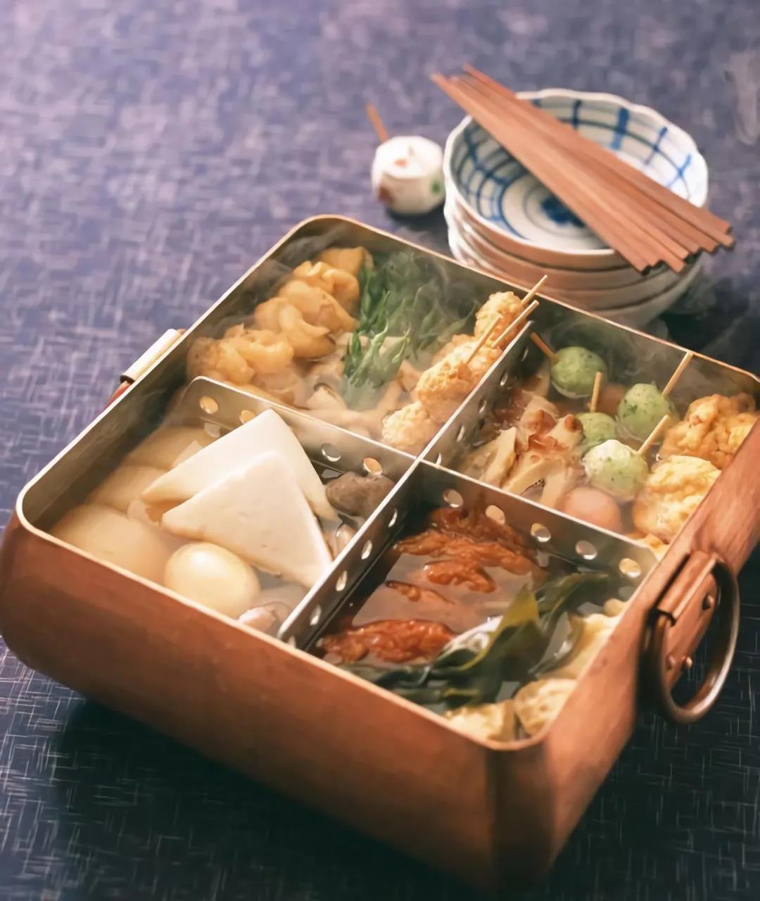 關東煮是日本人喜愛的小吃,本名御田,是一種源自日本關東地區(qū)的料理。通常材料包括雞蛋、蘿卜、土豆、海帶、蒟蒻、魚丸、竹輪(魚肉或豆的制品)等,將這些材料每一種都分別放在互不相通的鐵格子鍋(箱)里,用海帶木魚花熬制的高湯小火慢煮,煮好后有人喜吃原味,有人愛蘸醬(芥末醬、辣椒醬)。有說關東煮源自“味噌田樂”,那就是用水煮熟豆腐或者蒟蒻,再用味噌(麪豉)調(diào)味后進食。
