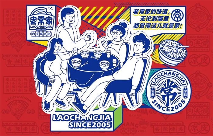 老常家肉夾饃,緣起于地道陜西美食,幾十年來堅持手工打饃,精選優(yōu)質(zhì)上等好豬肉每日小伙慢燉,饃焦香酥脆,肉肥而不膩,瘦而不柴。此次品牌設(shè)計是對老常家品牌的15年經(jīng)營的一個提升。LOGO的形狀是一塊出爐打包好的肉夾饃,饃被咬了一個小口,包裝紙平面里置放著老常家三字,字體線條下意識往下垂凹,使其與其他字體樣式區(qū)別開來,品類標(biāo)識用多個圓圈圈起來,對應(yīng)上肉夾饃的形狀。輔助圖形利用標(biāo)志和品類結(jié)合幾何圖形來塑造,是當(dāng)下眾多餐飲品牌會使用的一種輔助圖形設(shè)計方式,意在更好的傳達(dá)品牌的優(yōu)勢和賣點。