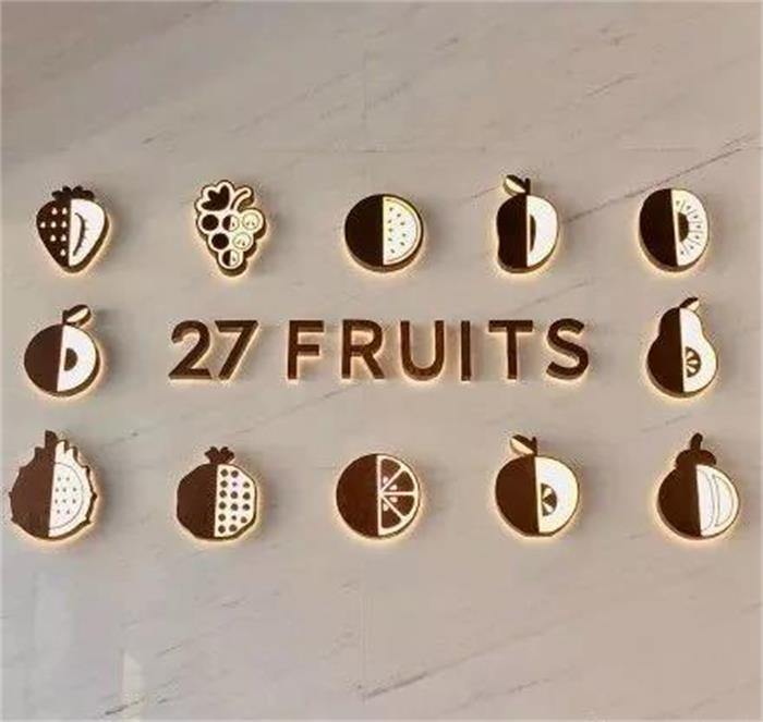 這是奈雪的茶旗下子品牌,使用了2016年度潘通色:靜謐藍(lán)和粉晶。兩者漸變成背景,LOGO是有金屬光澤的粉銅色,盡顯甜蜜氣氛,也延續(xù)了奈雪的輕奢優(yōu)雅風(fēng)格。LOGO用了無襯線的英文字體,中文是類似幼圓的筆畫纖細(xì)黑體字,字間距略寬,保持LOGO的透氣感,整體優(yōu)雅精致,符合年輕女性的氣質(zhì)。店內(nèi)的品牌形象背景墻,大理石的紋理襯著黃銅的金屬光澤,LOGO通過數(shù)字、英文、中文三者,不同的組合方式,呈現(xiàn)出豐富的品牌元素。輔助元素用了對比的方式呈現(xiàn),以普通的水果元素形成品牌獨特的視覺圖形,左邊是水果的外在形象,右邊是水果的內(nèi)在形象,兩者結(jié)合在一起,構(gòu)成水果的標(biāo)準(zhǔn)輪廓,不僅好看,還非常具有趣味性。