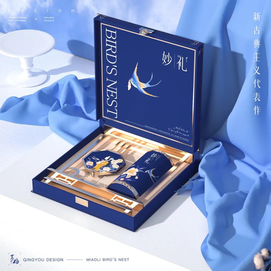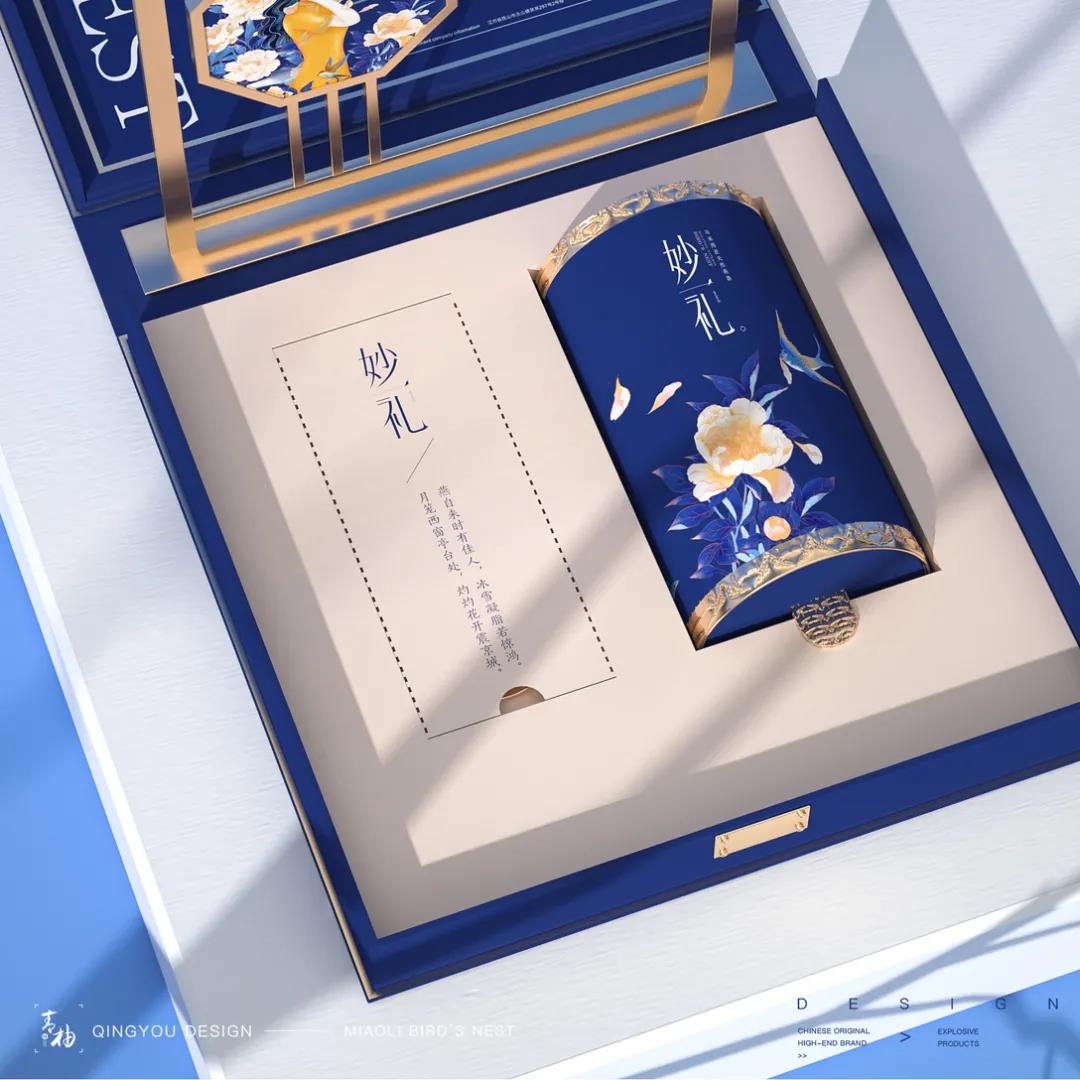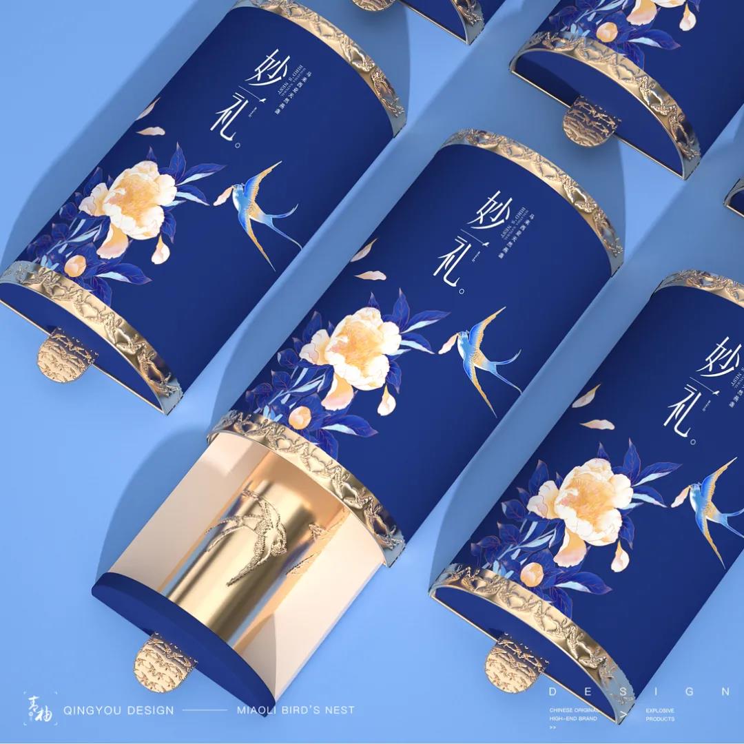 來自馬來西亞進(jìn)口品牌--妙禮燕窩。外觀創(chuàng)新的新包裝采用半弧形半圓柱體結(jié)構(gòu),可抽開式的內(nèi)置燕窩,使得產(chǎn)品具備獨(dú)一無二的視覺識(shí)別。禮盒選擇燕子作為超級(jí)符號(hào)切入點(diǎn),從LOGO設(shè)計(jì)衍生到外包裝的暗紋設(shè)計(jì),形成品牌自身的視覺邏輯。禮盒以體現(xiàn)皇家貢品的驚喜感進(jìn)行設(shè)計(jì),打開后可看見口含燕窩的金絲燕,中間的立體故宮角樓與窗花元素從蓋中出落,左側(cè)更有詩句映襯,使得包裝充滿互動(dòng)與故事。