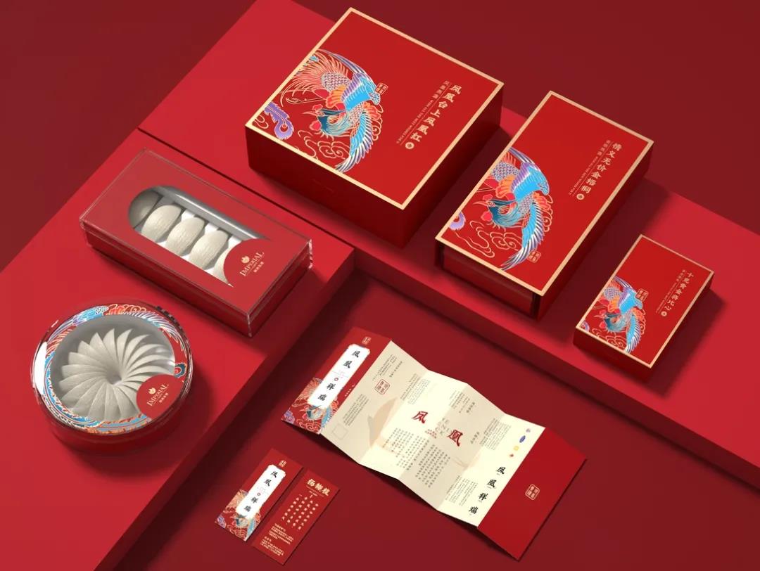 正紅色調(diào)搭配燙金詩句的外觀包裝,以文點(diǎn)題的傳達(dá)方式,在第一視覺上就能感受到傳統(tǒng)典禮的調(diào)性。插畫加入了中國祥瑞代表--鳳凰元素,以剪影和線描的形式將鳳凰與盒身整體相映襯,表現(xiàn)出了中國千年文化的韻味和氣息。此外內(nèi)盒還有半透明的亞克力版隔開外界,既能很好地保護(hù)產(chǎn)品本身,又能使得華麗的禮盒包裝多了幾分親切感。