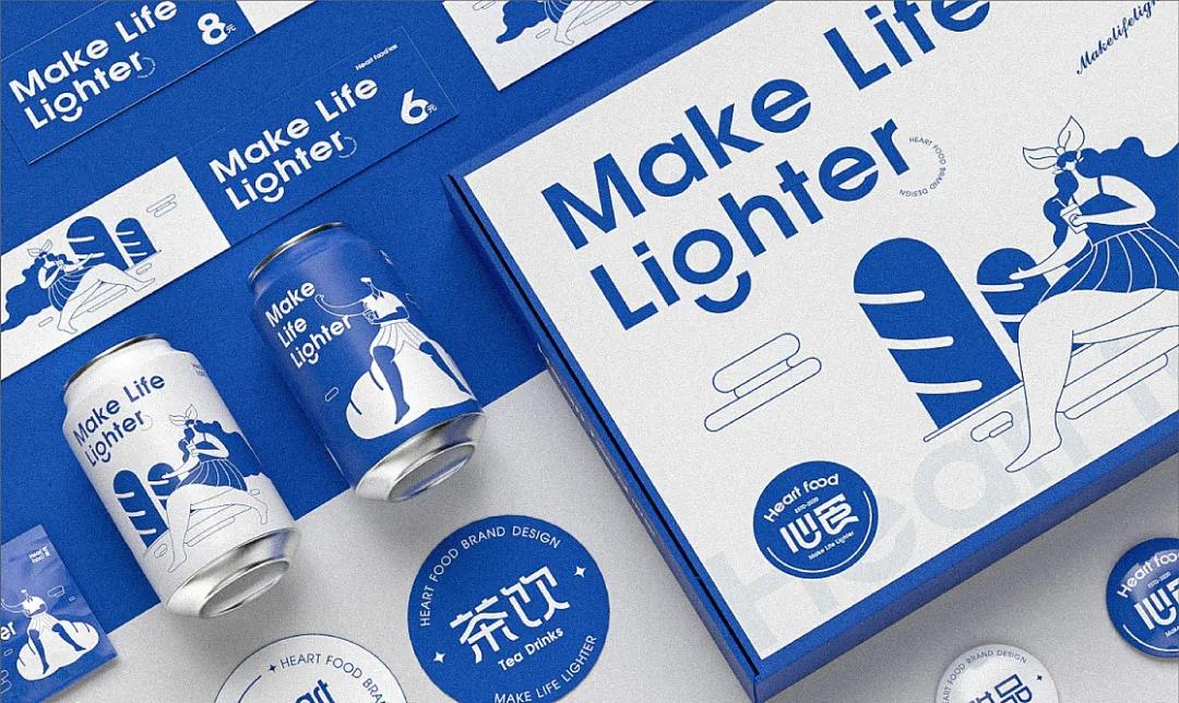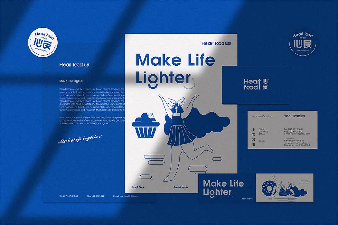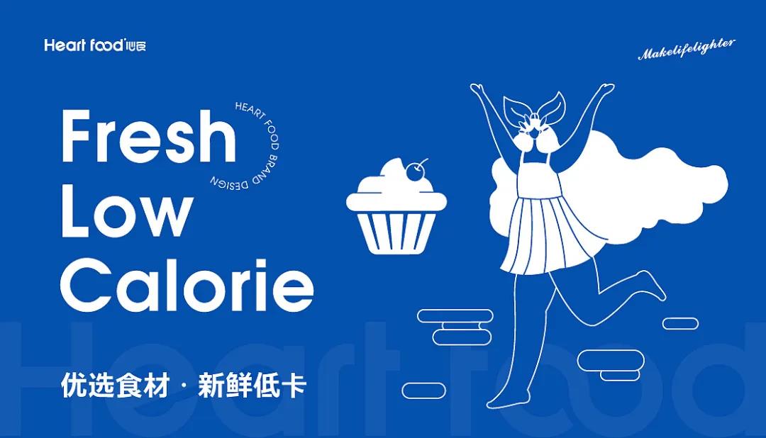 心食是一個(gè)集輕食、甜品、茶飲于一身的創(chuàng)新輕食品牌,針對(duì)新時(shí)代青年,主要是女性,對(duì)健康生活品質(zhì)的追求,以自然均衡、健康為品牌理念,將零負(fù)擔(dān)、零壓力、更健康帶給每一位顧客。品牌在視覺打造上,以藍(lán)色為主色調(diào),藍(lán)色象征著永恒,同時(shí)又能帶給人們清新、干凈通透的感覺,與輕食這一品類有著較高的契合度。品牌從英文“HeartFood”中延伸打造了一個(gè)無窮的超級(jí)符號(hào),這個(gè)超級(jí)符號(hào)代表著零負(fù)擔(dān)和零壓力,無窮也就是永恒,與品牌的使用色有一致的寓意。