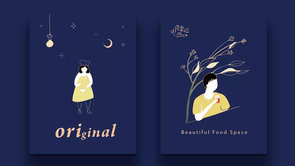 品牌VI以手繪風(fēng)格的插畫為主,構(gòu)建出烹飪和用餐的場(chǎng)景,再使用線稿和色塊的融合,清新又簡(jiǎn)約,形成獨(dú)特的、趣味感十足的品牌個(gè)性,讓人印象深刻、過目不忘。海報(bào)的設(shè)計(jì)用了品牌主色調(diào)深藍(lán)色作為背景,搭配鮮艷明亮的色塊、精致的線稿,深藍(lán)色減去了插畫多余的甜膩感,低調(diào)沉穩(wěn)中又帶有一絲活潑和趣味,色彩反差對(duì)比使畫面更顯精致。