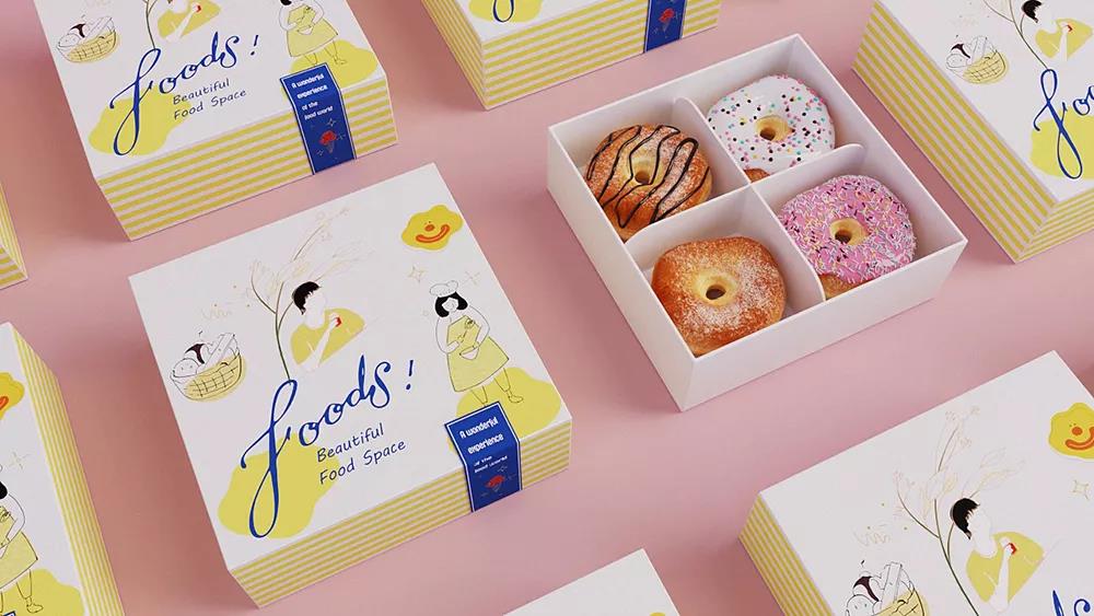 甜甜圈外帶盒包裝設(shè)計(jì),采用藍(lán)黃對(duì)比色的搭配,以大量的白調(diào)和,對(duì)比色的應(yīng)用使得包裝變得亮眼,整體充滿活力和甜蜜的感覺。