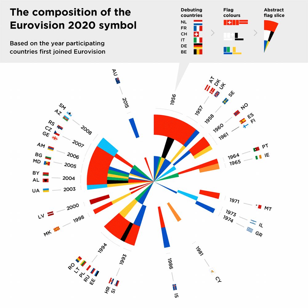 2019年11月28日,2020年第65屆歐洲歌唱大賽主視覺形象正式發(fā)布。新的Logo設(shè)計(jì)采用“數(shù)據(jù)可視化代理機(jī)構(gòu)”來(lái)設(shè)計(jì)——新的品牌按照41個(gè)參賽國(guó)自1956年以來(lái)每屆的參賽順序巧妙地結(jié)合在一起,創(chuàng)造了一個(gè)放射狀的圖形將所有參與國(guó)的國(guó)旗旋轉(zhuǎn)成一系列鮮艷的塊-所有這些都包含在歡樂的大風(fēng)車中。