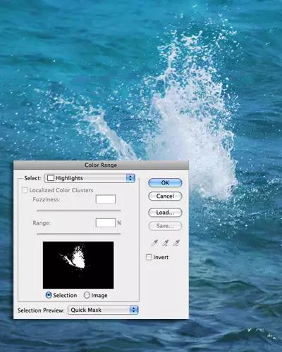選擇> 顏色范圍,利用顏色拾取器單擊對象。在這個(gè)例子中,我單擊的是水浪的白色區(qū)域。