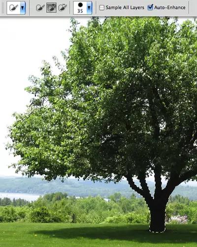 接下來,使用細(xì)化邊緣工具沿著選區(qū)的邊緣進(jìn)行描繪。對于樹葉部分可選用大尺寸畫筆,而有明顯輪廓邊緣的樹干部分選用較小的畫筆。還可以移動(dòng)調(diào)整邊緣滑塊對邊緣進(jìn)行光滑、羽化或硬化處理。