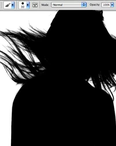 接著,使用一個(gè)黑色的畫筆補(bǔ)全模特身體的其他部分,白色畫筆用于描繪背景中的暗色區(qū)域。