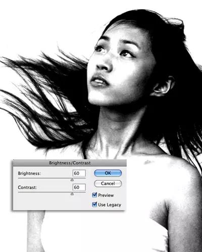 選擇被復(fù)制的圖層,點(diǎn)擊圖像>調(diào)整>亮度/對比度,在不減少發(fā)絲的前提下,盡可能地調(diào)高亮度和對比度。理想狀態(tài)下,可以將背景調(diào)成純白色,而頭發(fā)為純黑色。